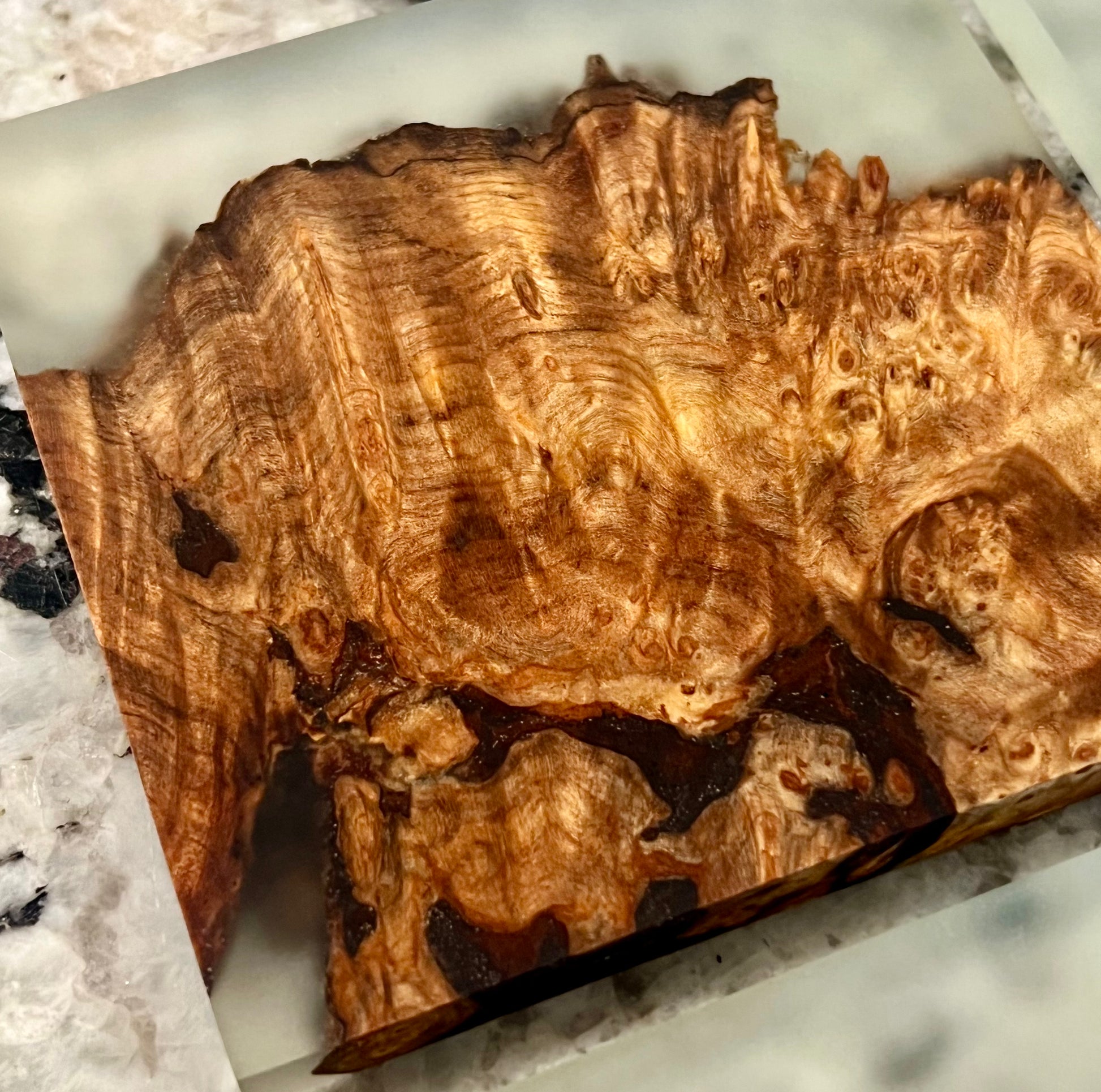 Sourced from burled maple wood, these coasters showcase wildly intricate, swirling grain patterns with “eyes” and knots that give each piece depth and character. Maple burl’s creamy tones contrast beautifully with the epoxy.