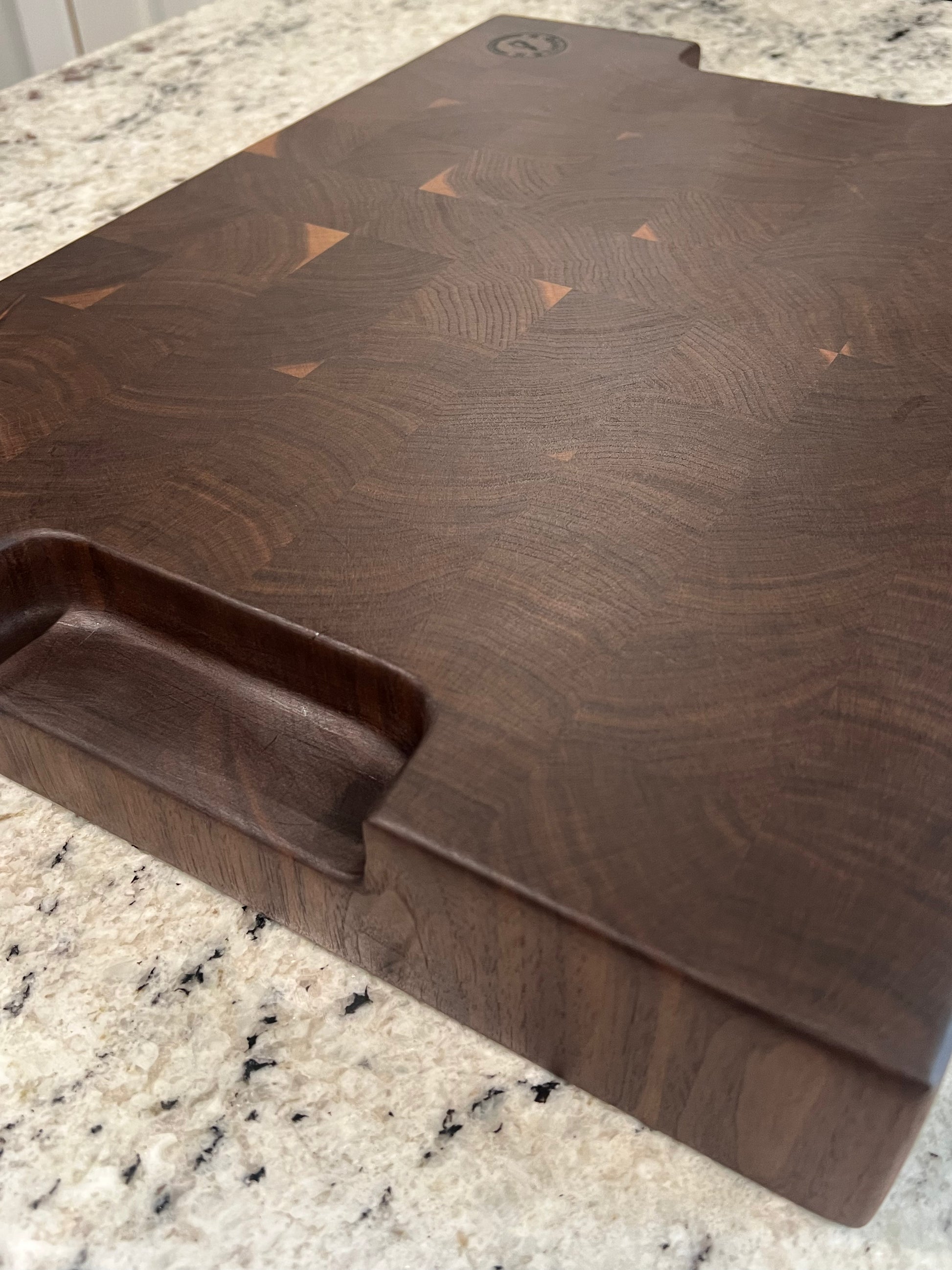 Bring professional-quality craftsmanship to your kitchen with this premium end grain walnut butcher block. Made from carefully selected, solid walnut, the end grain construction ensures exceptional durability and longevity, while providing a self-healing surface that is gentle on knives. The rich, natural tones and intricate grain patterns of walnut make each board a unique and elegant addition to your kitchen.