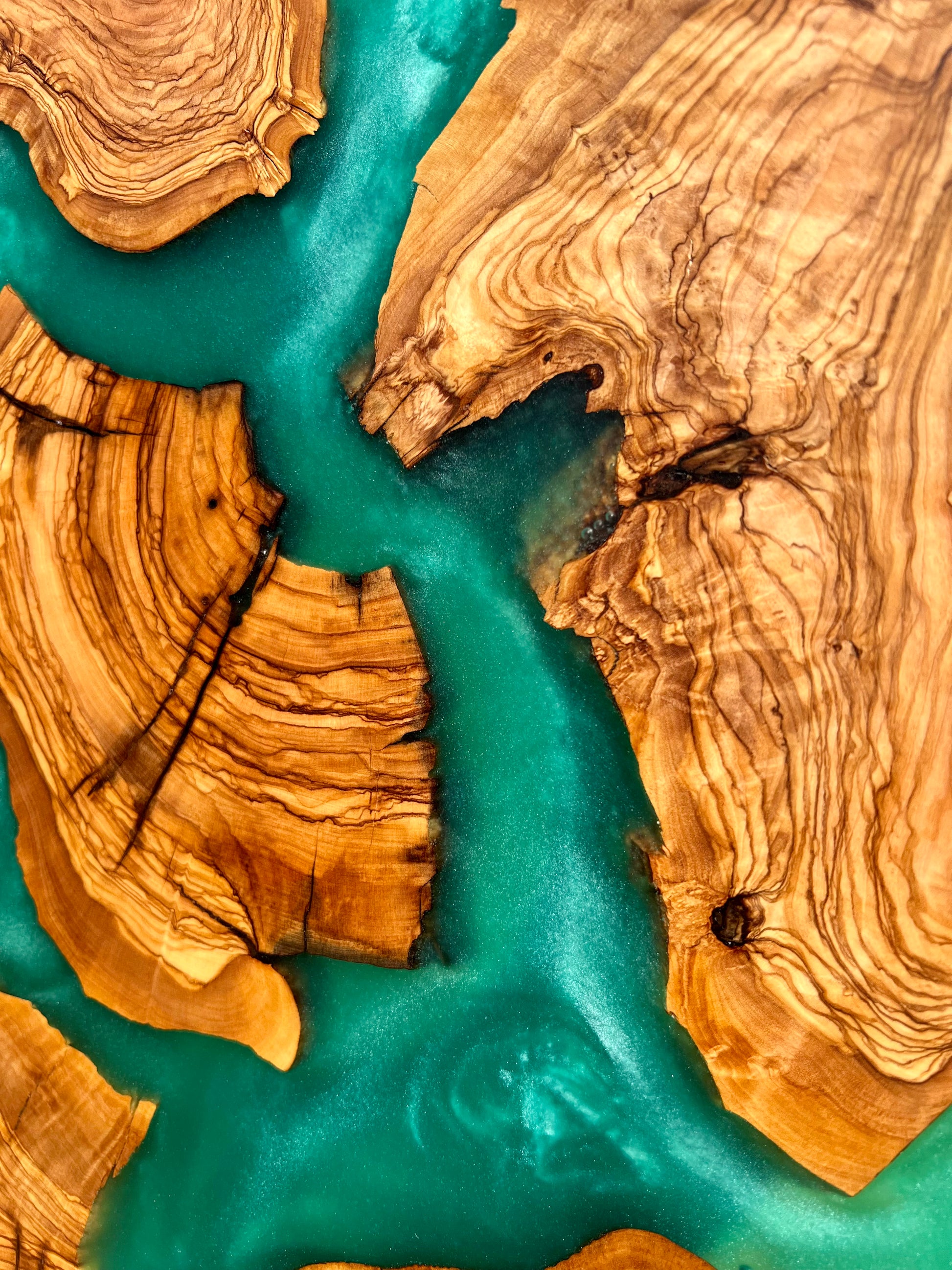 Elevate your dining experience with this stunning Lazy Susan, handcrafted from richly grained olive wood and infused with vibrant green epoxy. Each piece is a one-of-a-kind fusion of organic beauty and modern artistry, showcasing the swirling patterns of Mediterranean olive wood contrasted by the luminous depth of emerald epoxy.