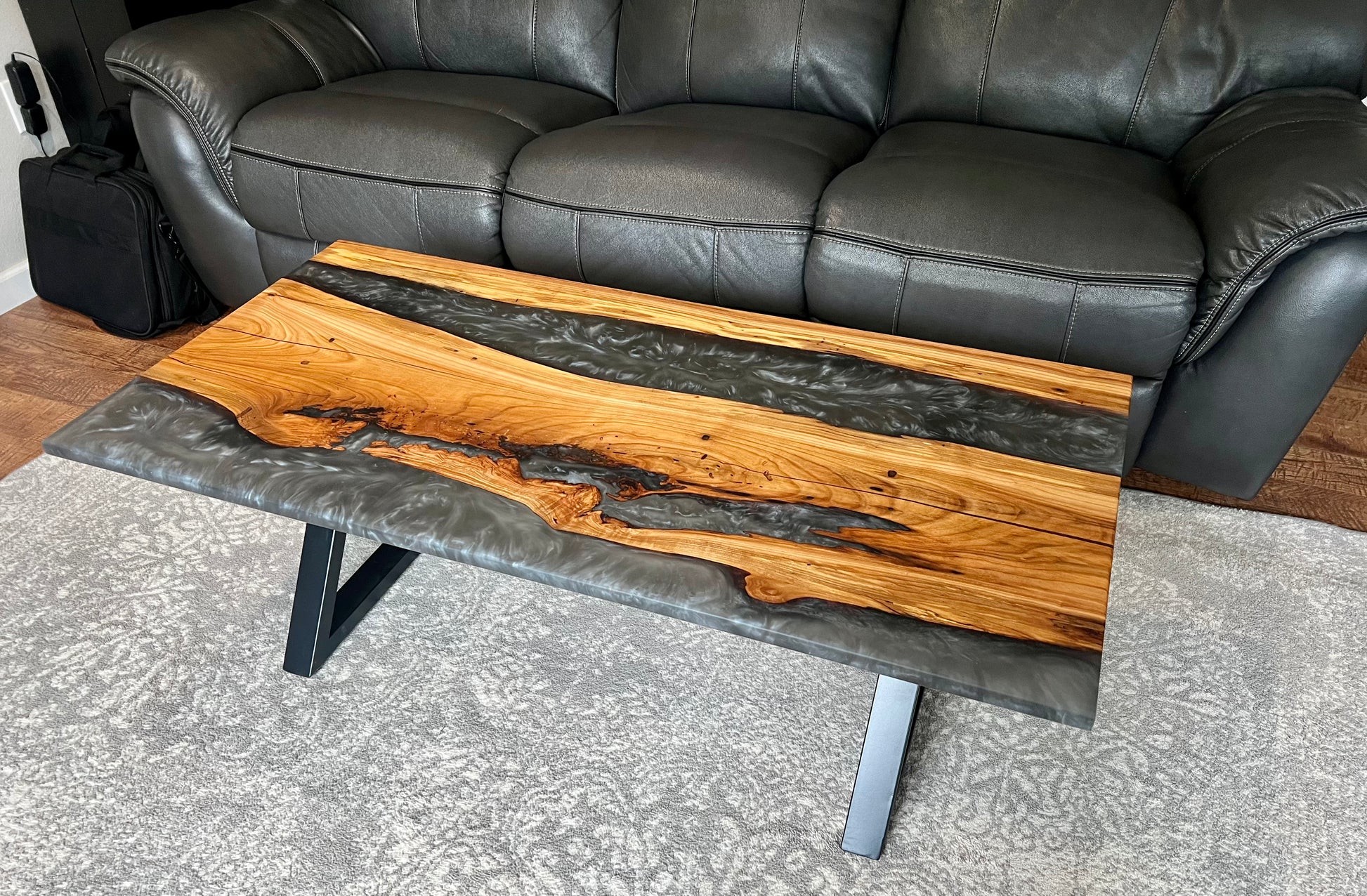 Bring a touch of modern elegance and natural beauty to your living space with this handcrafted live edge coffee table. Rich cherry wood showcases its natural grain and character, while storm grey epoxy fills the spaces between, creating a striking river-like effect that adds depth and visual interest.