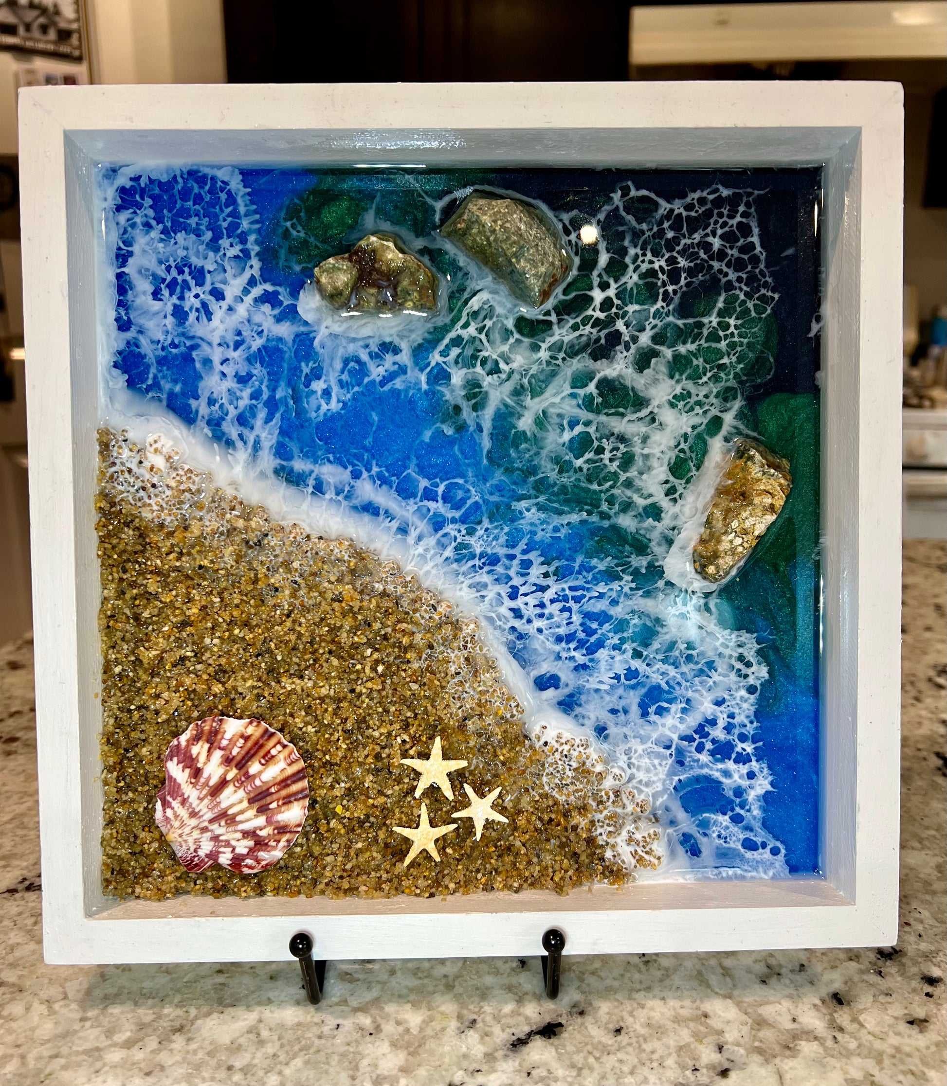 Bring the natural beauty of the shoreline into your space with this handcrafted ocean epoxy art featuring real shells and rocks. Flowing layers of blue and turquoise resin create a realistic ocean effect, capturing the movement of waves as they meet the shore. Carefully placed natural shells and stones add texture, depth, and an authentic coastal feel.